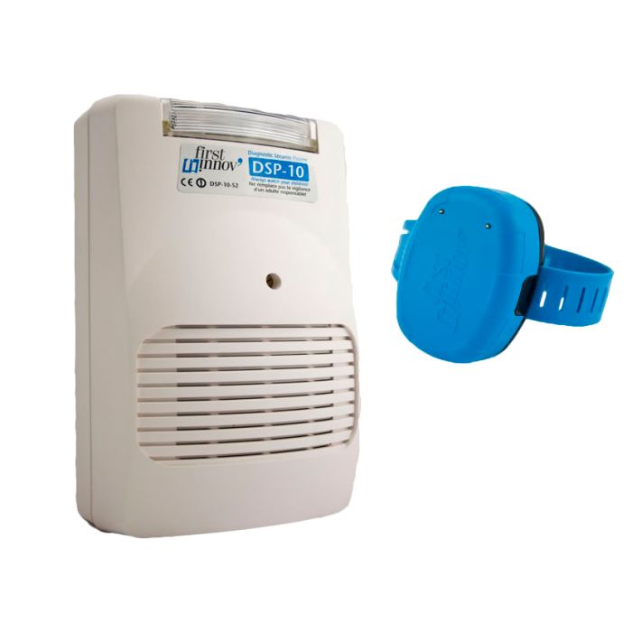 ondas de radio y activa una alarma sonora. El Kit consta de la alarma con sirena para instalar en la pared y de un brazalete de seguridad. Conforme con las normativas de seguridad mas avanzadas a nivel internacional (NF 90-307-1).
